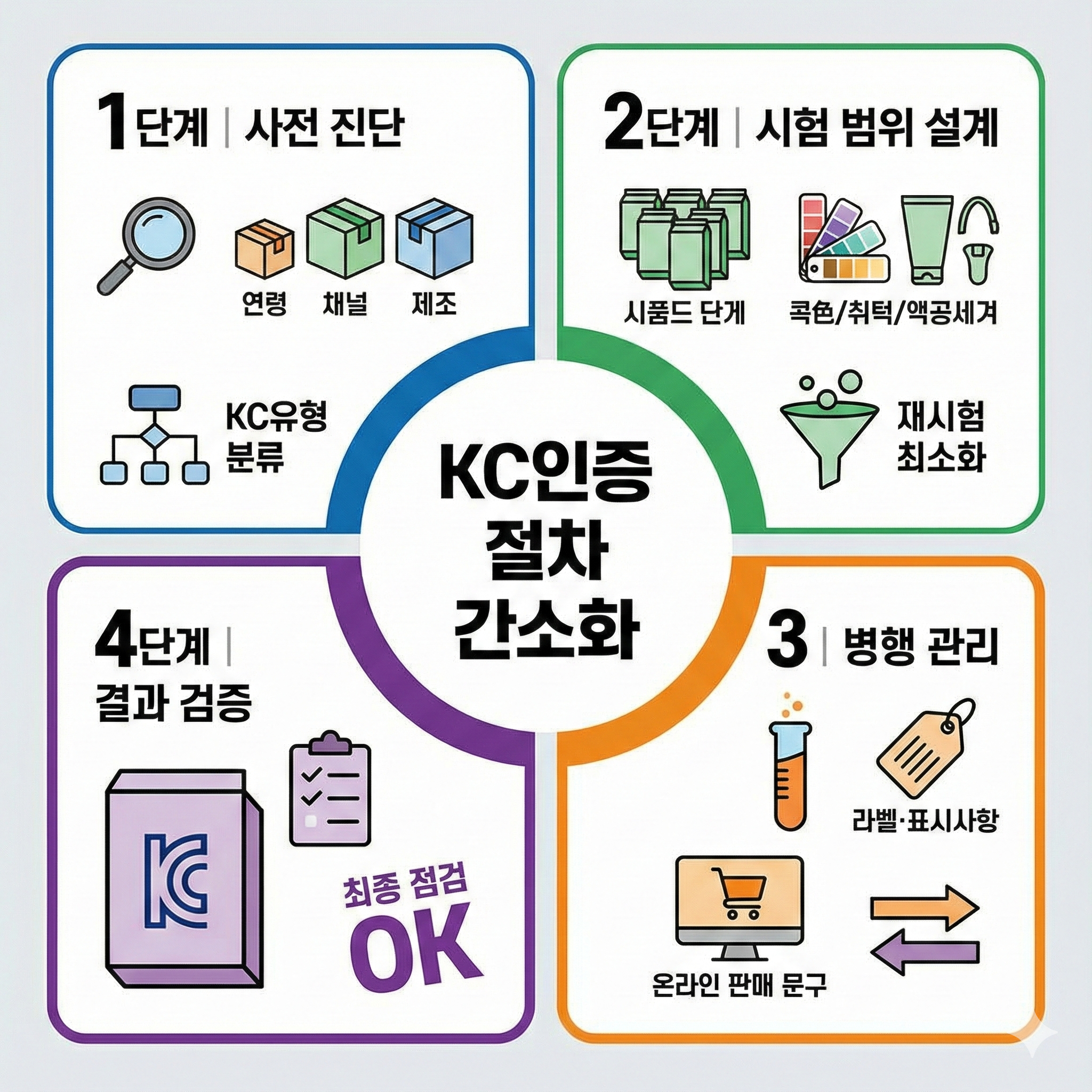 많은 업체가 범하는 치명적인 실수는 판매 구성(색상, 옵션, 세트)이 확정되지 않은 상태에서 무턱대고 시험부터 의뢰하는 것입니다. 이 경우, 작은 부자재 하나만 바뀌어도 전체 재시험을 해야 하거나, 불필요한 항목까지 시험하여 비용이 눈덩이처럼 불어납니다. 따라서 KC인증은 시험 접수 전, 제품 구성을 분석하여 최소한의 시험으로 통과할 수 있도록 '설계'하는 과정이 반드시 선행되어야 합니다.