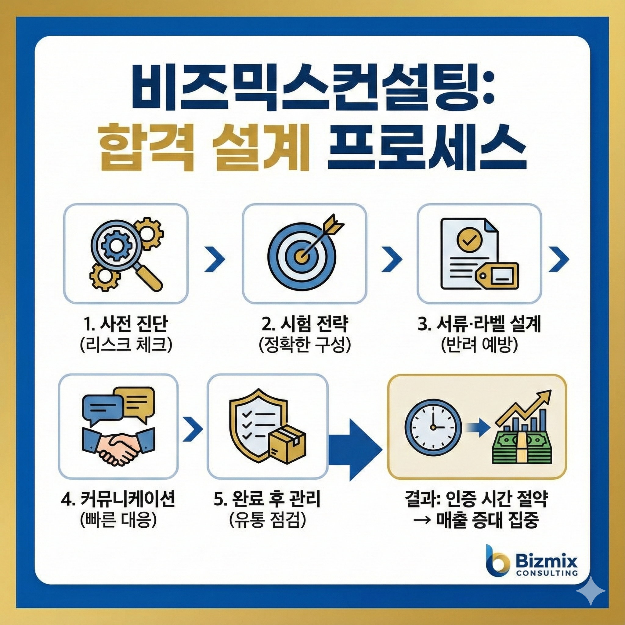 대표님은 판매와 브랜딩에만 집중하세요. 인증은 아래의 체계적인 5단계 프로세스를 통해 저희가 전담합니다.